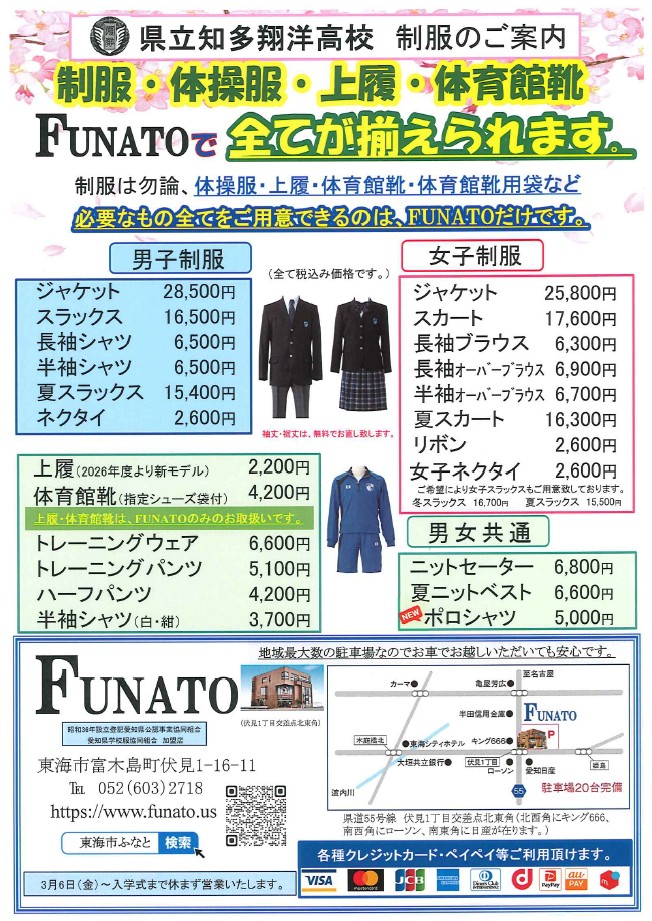 愛知県立知多翔洋高等学校の制服・体操服・上履・体育館シューズのご案内をさせていただきます。